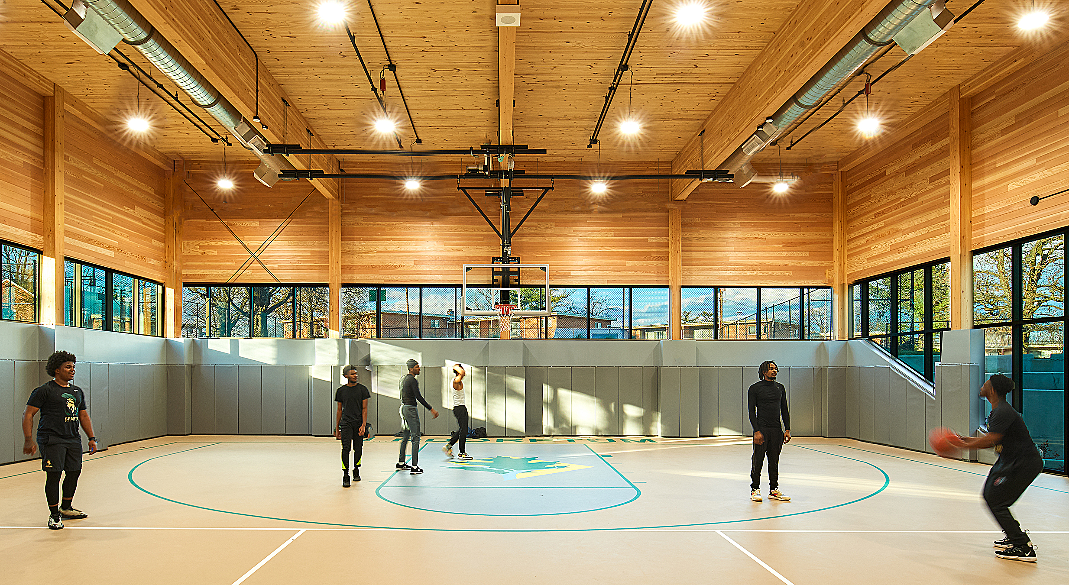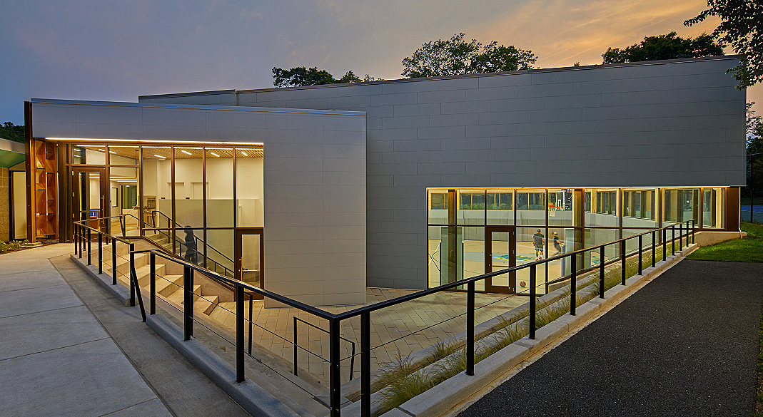 A glass connector piece abuts the exiting Field House allowing a daylit lobby and a subtle touch on the historic building while also blurring the lines between interior and exterior. A metal screening element brings a sculptural touch to the project in addition to shading the community room and framing the entrance to the center. The partially sunken community room allows for access to an ample patio, continuing the physical and visual access to exterior spaces as a theme throughout the building. This partially sunken space also allows for a high ceiling which adds to the versatility and flexibility of the room as requested by the community. The Gym being recessed 7′ below grade allows us to expand to an exterior amphitheater and maintaining a connection to the exterior landscape while also creating the height needed for a solar chimney and not towering over the existing historic building. This gym is constructed of CLT, a sustainable wood construction method, adding to the green nature of the building while also bringing warmth to an otherwise often stark typology. Other features such as the green roof and Solar panel array as well as rainwater retention add to the buildings sustainability.By creating a building that plays with level changes and materiality we are able to enhance flexibility of space and find a harmony between the mid-century modern Field House and the New Addition.